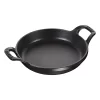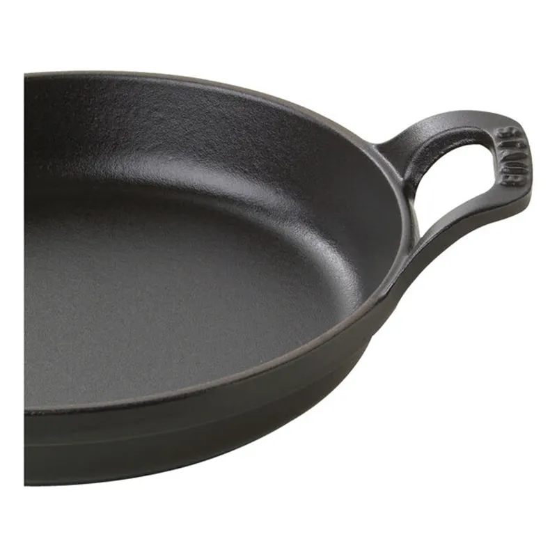 La resistente fuente de la serie de platos de servir de Staub es de hierro colado, que garantiza una excelente retención y una difusión uniforme del calor. Los alimentos se cocinan de forma suave y saludable. Este recipiente es duradero, resistente y también muy fácil de lavar. Su forma lo hace indicado para todas las superficies de cocción y placas de inducción. Las sólidas asas se integran en el borde de la fuente. Al usarla, la seguridad está garantizada. Dado que es apilable con otras fuentes de la misma gama, este versátil utensilio ocupará muy poco espacio en los armarios de la cocina. La fuente redonda de 20 cm y 0,75 litros de capacidad es perfecta para elaborar cantidades pequeñas de comida. En este funcional recipiente, los alimentos, sellados primero sobre los fogones, adquieren una atractiva superficie dorada en el horno. La versátil fuente Staub de color gris grafito conquistará por igual a cocineros experimentados y a principiantes.